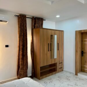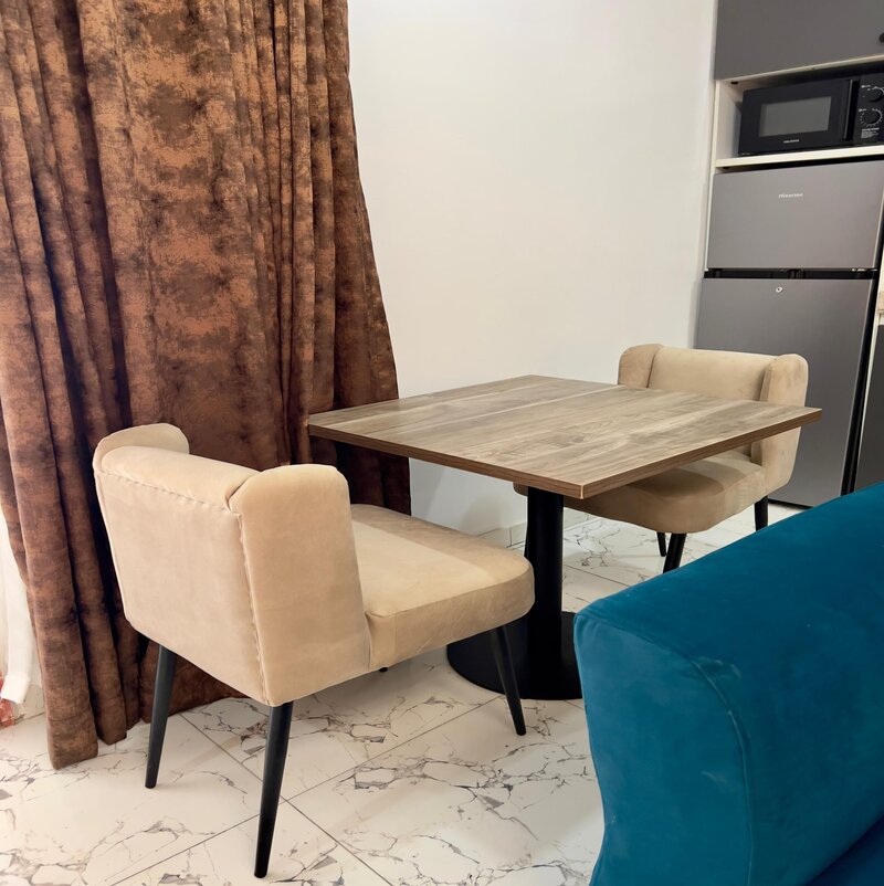 - Spacious studio living area with L-shaped couch and Queen-sized bed.